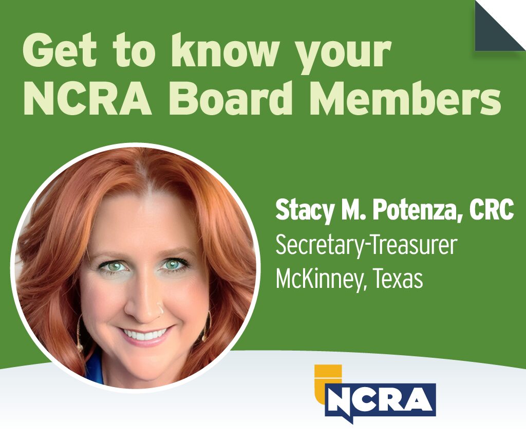 Name: Stacey Potenza, CRCLocation: McKinney, TexasMember since: 2003NCRA Board of Directors: 2022-2026 JCR | How did you hear about court reporting? SP | I first…