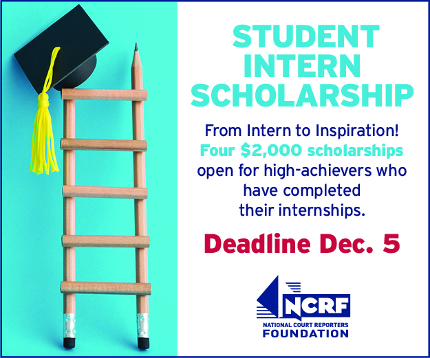 The National Court Reporters Foundation (NCRF) Student Intern Scholarship offers four $2,000 awards for high-achieving court reporting or captioning students who have completed the internship portion of their education. Applicants are nominated by their school and must fulfill scholarship requirements including writing a short essay. The deadline to apply is Dec. 5