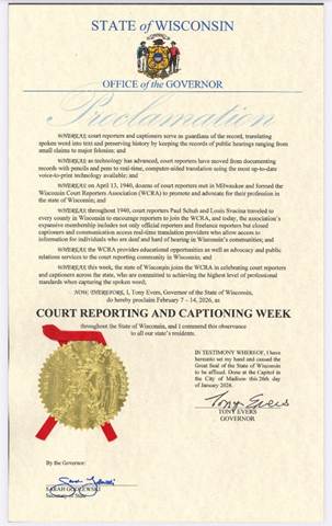 Members of the Wisconsin Court Reporters Association were also successful in securing a proclamation from that state’s Gov. Tony Evers.